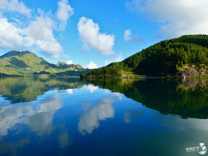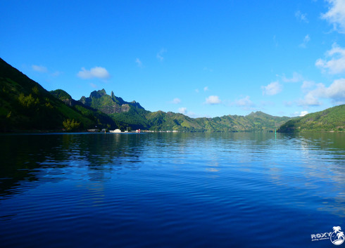 ROXY s’engage dans le petit chenal aux premières lueurs de l’aube ; pas de vent, pas une risée, pas un son. L’odeur de la pinède caressée par les premiers rayons du jour est un vrai délice, et on perçoit immédiatement que le paysage diffère complètement. Un court instant on se croirait sur un fjord scandinave, proche du Svalbard. C’est somptueux. Et pour cause, nous sommes sur la seule île de Polynésie où le cocotier ne pousse pas… (L’hiver est trop froid ; entre 5 et 10°C.)
